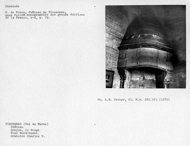 POP | Plateforme ouverte du patrimoineCheminée d'angle de l'oratoire Charles V. Tour nord-ouest au deuxième étage du donjon, linteau et hotte