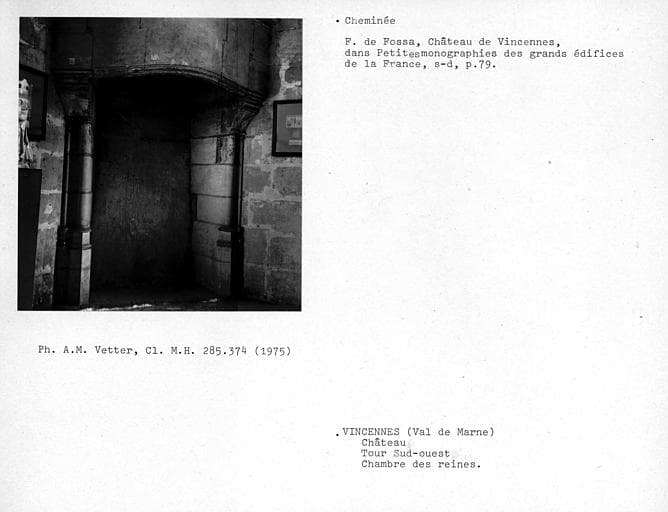 Cheminée d'angle de la chambre des Reines. Tour sud-ouest au deuxième étage du donjon, piédroits et linteau