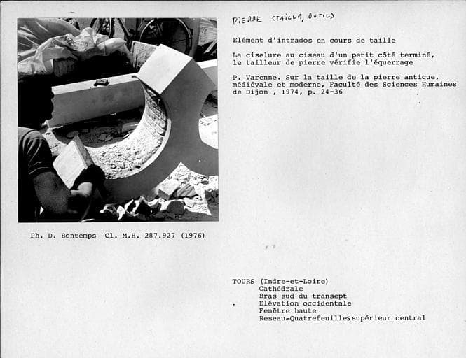 POP | Plateforme ouverte du patrimoineBras sud du transept, élévation occidentale, fenêtre haute, quatrefeuilles supérieur central du réseau. Elément d'intrados en cours de taille. La ciselure au ciseau d'un petit côté terminé, le tailleur de pierre vérifie l'équerrage