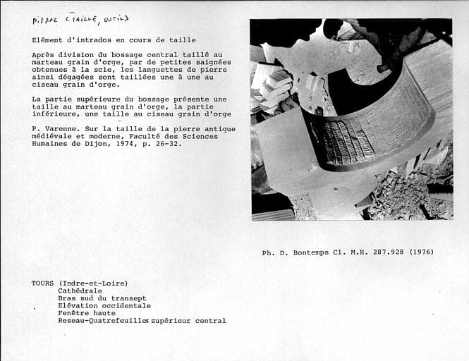 Bras sud du transept, élévation occidentale, fenêtre haute, quatrefeuilles supérieur central du réseau. Elément d'intrados en cours de taille. Après division du bossage central taillé au marteau grain d'orge, par de petites saignées obtenues à la scie, l