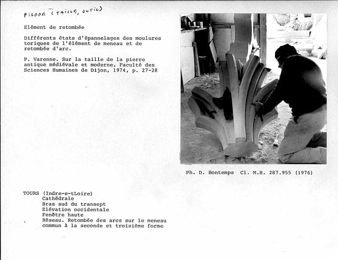 Bras sud du transept, élévation ouest, fenêtre haute. Elément de retombée d'arc du réseau, différents états d'épannelages des moulures toriques de l'élément de meneau et de retombée d'arc