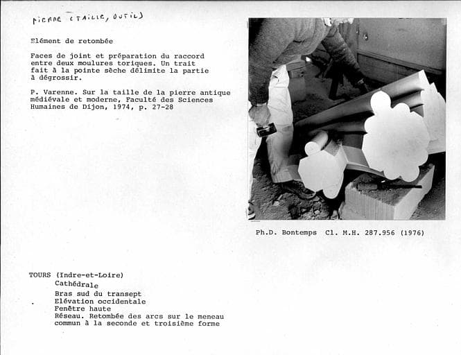 POP | Plateforme ouverte du patrimoineBras sud du transept, élévation ouest, fenêtre haute. Elément de retombée d'arc du réseau, faces de joint et préparation du raccord entre deux molures toriques. Un trait fait à la point sèche délimité la partie à dégrossir