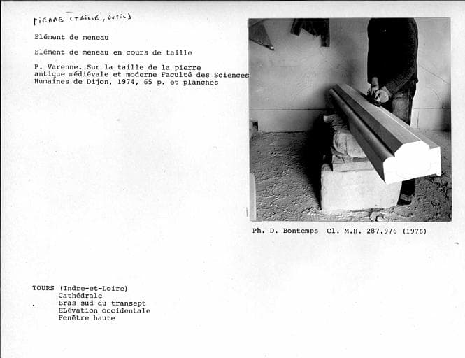 POP | Plateforme ouverte du patrimoineBras sud du transept, élévation ouest, fenêtre haute. Elément de meneau en cours de taille