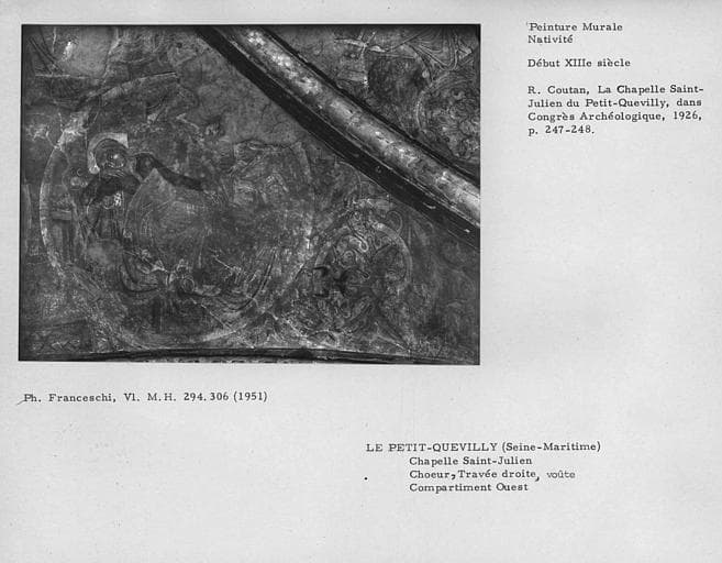 Chapelle Saint-Julien. Détail de la peinture murale sur le compartiment ouest de la voûte de la travée droite du choeur : la Nativité