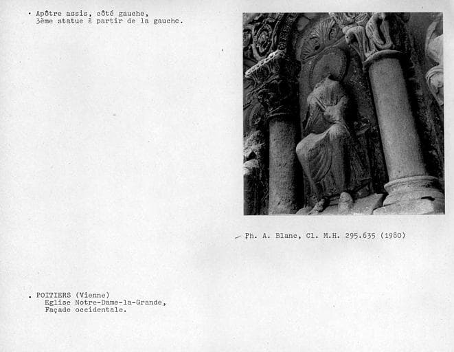 POP | Plateforme ouverte du patrimoineFaçade occidentale, portail aveugle de gauche. Apôtre assis du côté gauche, troisième statue au-dessus du portail à partir de la gauche