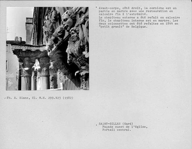 POP | Plateforme ouverte du patrimoineFaçade ouest de l'église, portail central. Avant-corps, côté droit. Corniche ancienne en partie en marbre, avec une restauration en calcaire fin à l'extrémité. Le chapiteau externe a été refait en calcaire fin, le chaptieau interne est en marbre. Les deux