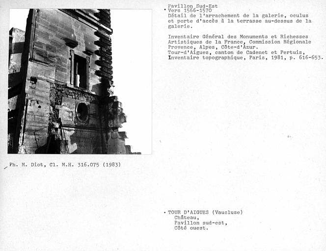 Détail de l'arrachement de la galerie du pavillon sud-est, oculus et porte d'accès à la terrasse au-dessus de la galerie