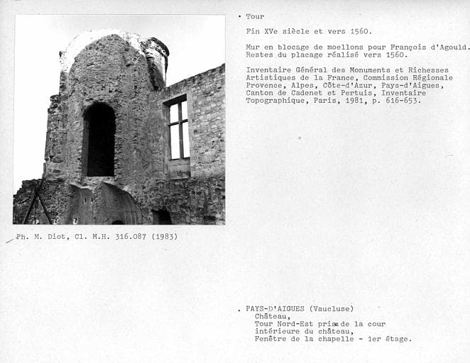 POP | Plateforme ouverte du patrimoineTour nord-est, vue prise de la cour, maçonnerie du moyen-âge et fenêtre du premier étage au niveau de la chapelle