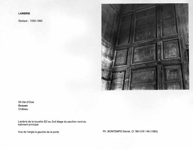 POP | Plateforme ouverte du patrimoineLambris de la tourelle sud-ouest, second étage du pavillon est de l'aile sud. Vue de l'angle à gauche de la porte