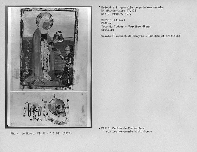 POP | Plateforme ouverte du patrimoineRelevé de peinture murale de l'oratoire au deuxième étage de la tour du trésor : Sainte-Elisabeth de Hongrie, emblème et initiales