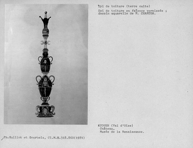 Dessin aquarellé d'un épi de toiture en terre cuite vernissée déposé au château
