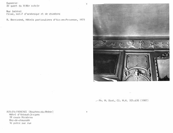 POP | Plateforme ouverte du patrimoineGypserie de la première pièce du rez-de-chaussée, motif d'arabesque et de chimères de la corniche et haut de panneau en stuc du mur latéral droit