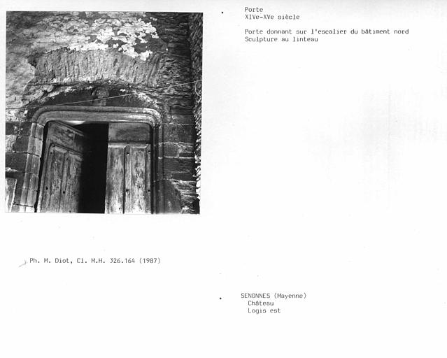 Logis est. Partie supérieure de la porte tiercée donnant sur l'escalier du bâtiment nord au rez-de-chaussée. Sculpture du linteau
