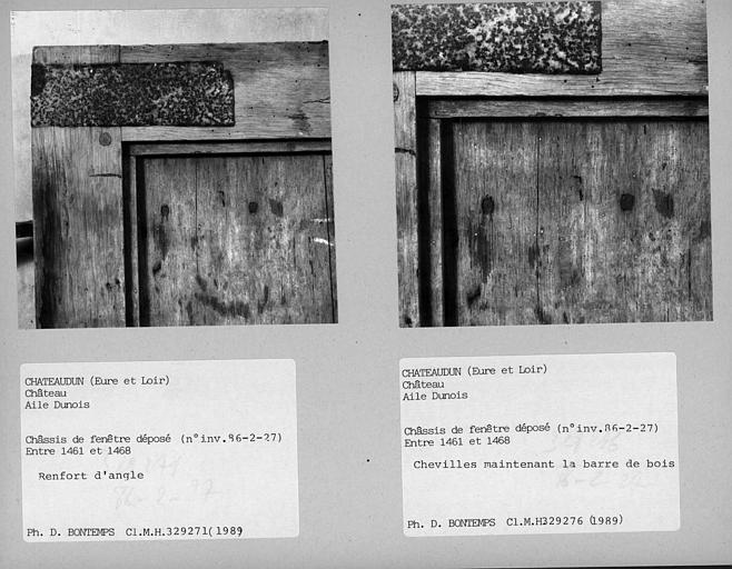 POP | Plateforme ouverte du patrimoineMenuiserie de fenêtre de l'aile Dunois, châssis haut déposé, détail du renfort d'angle en fer et des chevilles