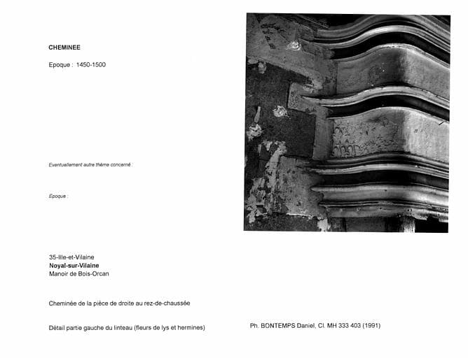 POP | Plateforme ouverte du patrimoineCheminée de la pièce de droite au rez-de-chaussée. Détail partie gauche du linteau (fleurs de lys et hermines)
