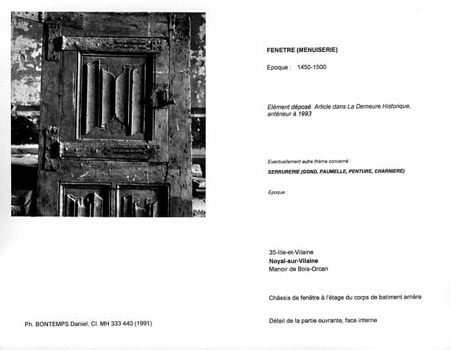 POP | Plateforme ouverte du patrimoineChâssis de fenêtre à l'étage du corps de batiment arrière, déposé. Détail de la partie ouvrante, face interne