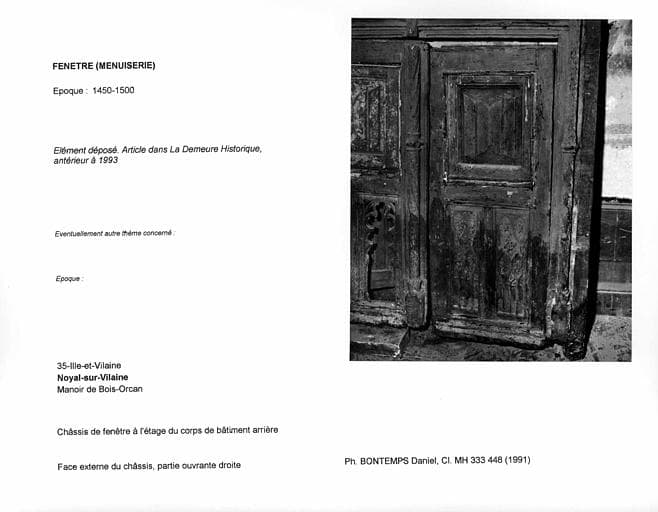 Châssis de fenêtre à l'étage du corps de bâtiment arrière, déposé. Face externe du châssis, partie ouvrante droite
