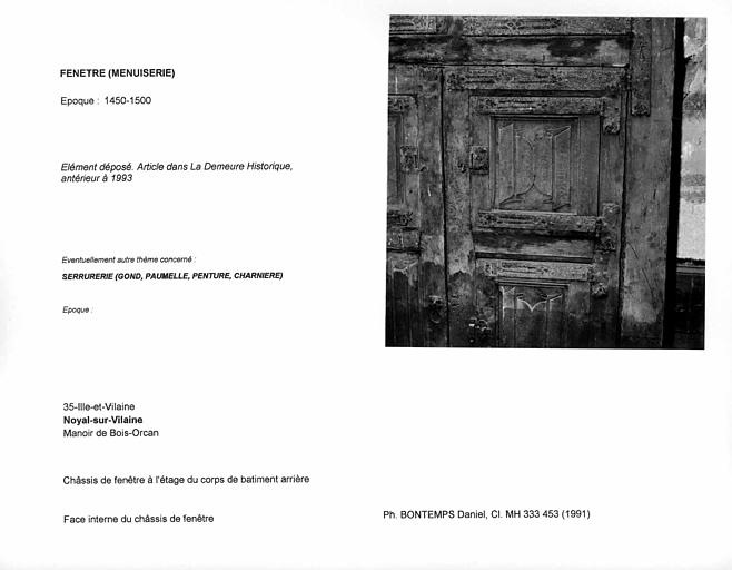Châssis de fenêtre à l'étage du corps de batiment arrière, déposé. Face interne du châssis de fenêtre