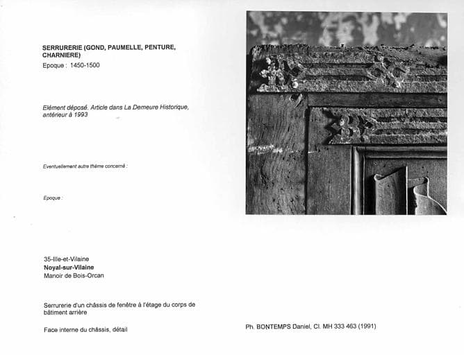 Serrurerie d'un châssis de fenêtre à l'étage du corps de bâtiment arrière. Face interne du châssis, détail