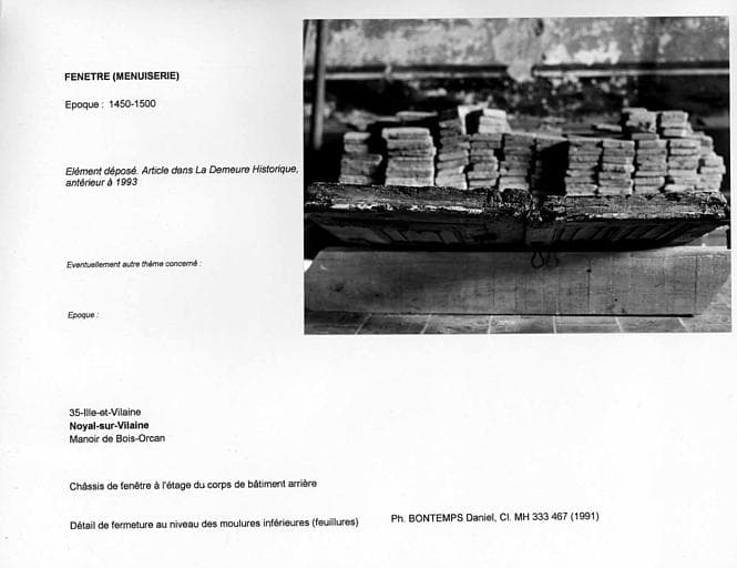 POP | Plateforme ouverte du patrimoineChâssis de fenêtre à l'étage du corps de bâtiment arrière, déposé. Détail de fermeture au niveau des moulures inférieures (feuillures)