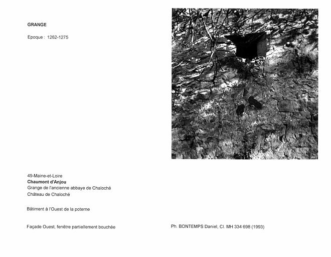Bâtiment de la grange à l'ouest de la poterne. Façade ouest, fenêtre partiellement bouchée