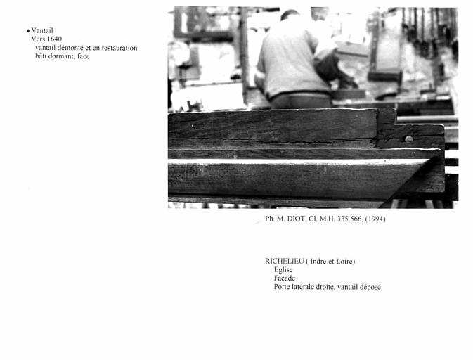 Vantail de la porte latérale droite de la façade, démonté et en restauration. Bâti dormant, face