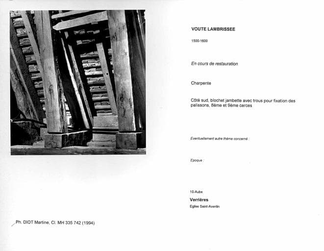 Charpente lambrissée. Côté sud, blochet jambette avec trous pour fixation des palissons, huitième et neuvième cerces