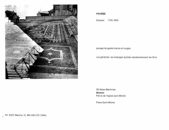 POP | Plateforme ouverte du patrimoineParvis de l'église Saint-Michel. Pavage de galets blancs et rouges. Vue générale, les losanges stylisés représenteraient les Grimaldi et les H Honoré III