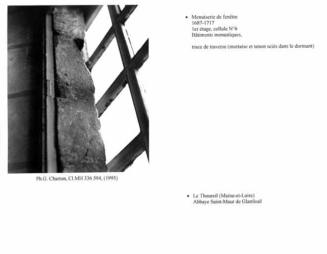 Fenêtre dans la cellule n°6 au premier étage, bâtiments monastiques. Détail d'une trace de traverse vers le tableau de droite