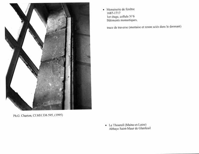 Fenêtre dans la cellule n°6 au premier étage, bâtiments monastiques. Détail d'une trace de traverse vers le tableau de gauche