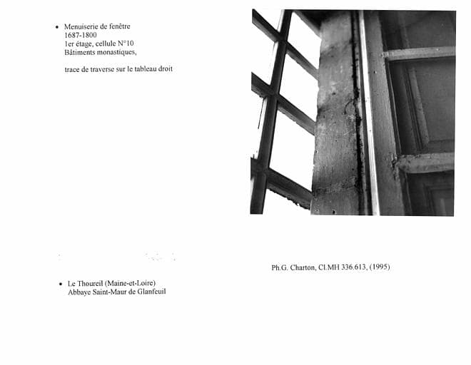 Fenêtre dans la cellule n°10 au premier étage, bâtiments monastiques. Détail de la trace de traverse sur le tableau droit