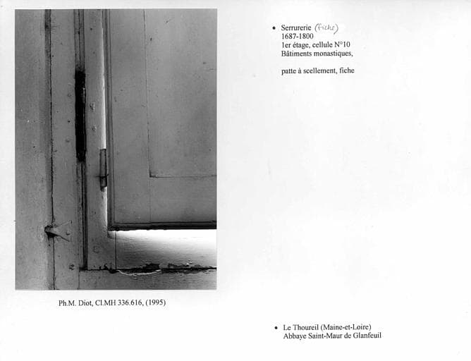 POP | Plateforme ouverte du patrimoineFiche sur la fenêtre, dans la cellule n°10 au premier étage, bâtiments monastiques. Partie basse du volet gauche, patte à scellement, fiche