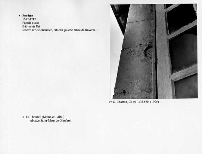 Fenêtre de la façade ouest au rez-de-chaussée, bâtiment est. Détail d'une trace de traverse, tableau gauche