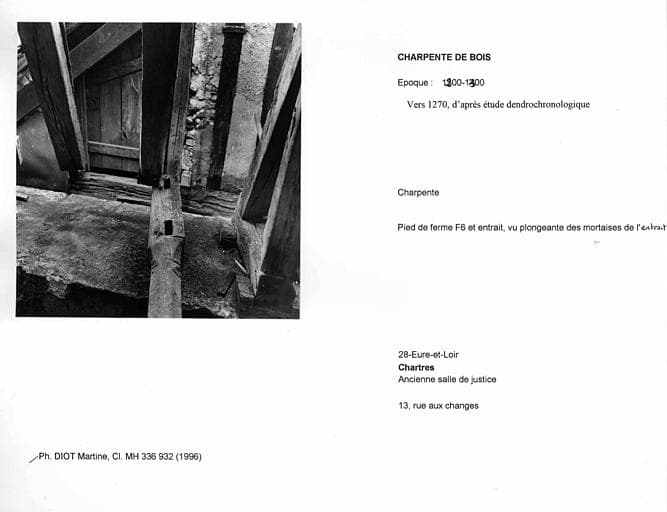 Charpente de bois. Pied de ferme F6 et entrait, vue plongeante des mortaises de l'entrait