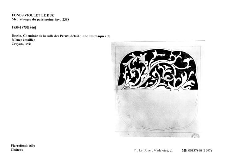 POP | Plateforme ouverte du patrimoineAile nord-ouest ; Salle des Preu. Dessin. Cheminée de la salle des Preux, détail d'une des plaques de faïence émaillée