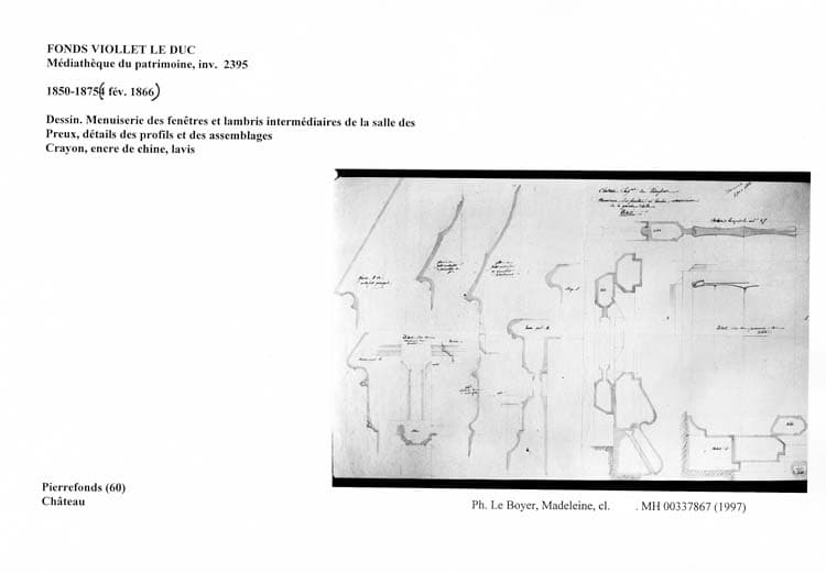 Aile nord-ouest ; Salle des Preu. Dessin. Menuiserie des fenêtres et lambris intermédiaires de la salle des Preux, détails des profils et des assemblages