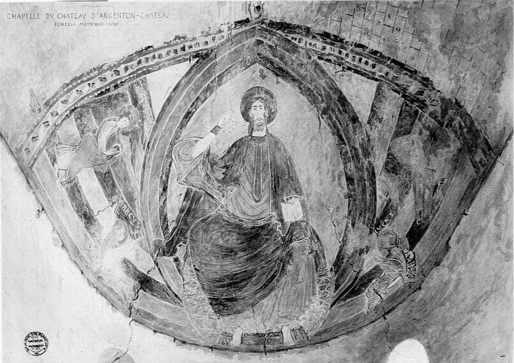 Relevé de peintures murales de la voûte du choeur de la chapelle : le Christ en majesté entouré du symbole des évangélistes