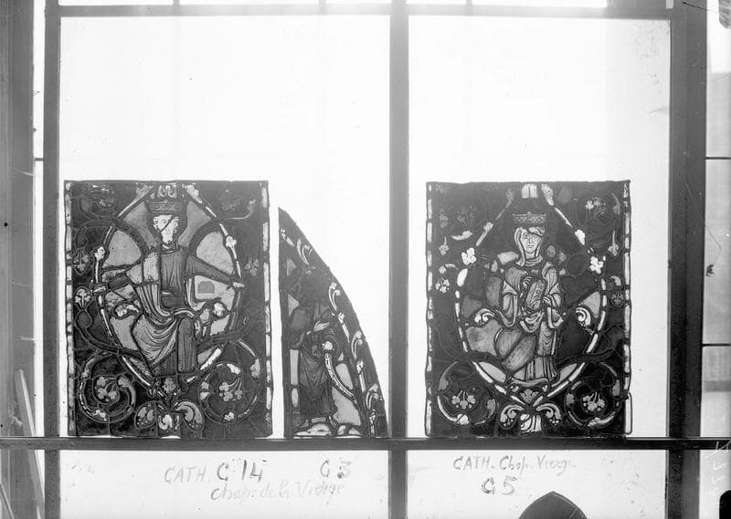 Panneau de vitrail de la chapelle de la Vierge, travées C, D et rosace
