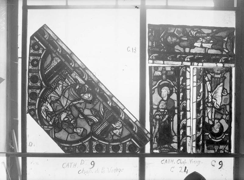 Panneau de vitrail de la chapelle de la Vierge, travées C, D et rosace