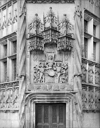 POP | Plateforme ouverte du patrimoineTour octogonale accolée à la façade du logis (partie droite), dite tour du Lion. Décor sculpté surmontant la porte de l'escalier : deux sauvages nus supportant un écusson