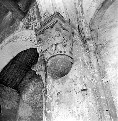 Vue intérieure : Chapiteau historié. Anges et personnage dans une mandorle