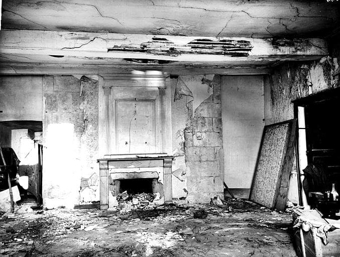 Vue intérieure du côté ouest : Salle avec cheminée en ruines