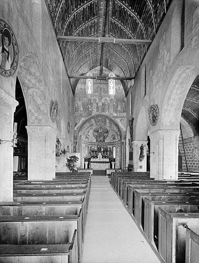 Vue intérieure de la nef vers le choeur orné de peintures murales