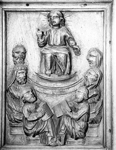 POP | Plateforme ouverte du patrimoineChaire à prêcher, panneau sculpté de la cuve : Christ au milieu des docteurs