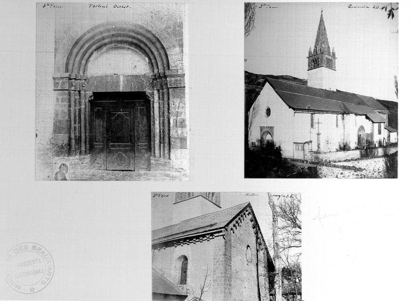 Trois vues extérieures : portail de la façade ouest. Ensemble sud-ouest. Chevet, côté sud-est