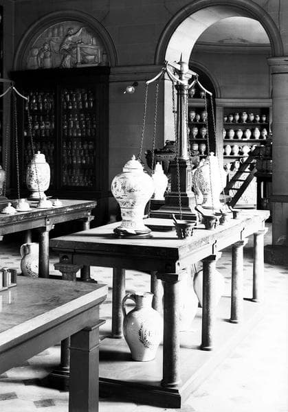 Vue intérieure d'une salle avec des étagères et des pots de pharmacie