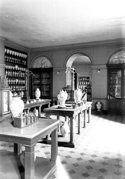 Vue intérieure d'une salle avec des étagères et des pots de pharmacie