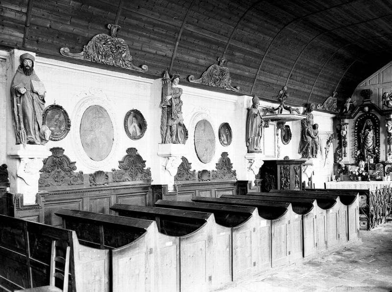 Vue intérieure de la nef, côté nord : lambris en bois sculpté et chaire à prêcher