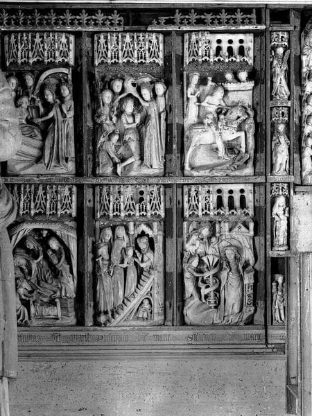 Retable du maître-autel, bas-relief et statuettes en albâtre : scènes de la vie de la Vierge et de la vie saint Georges (détail de la partie gauche)