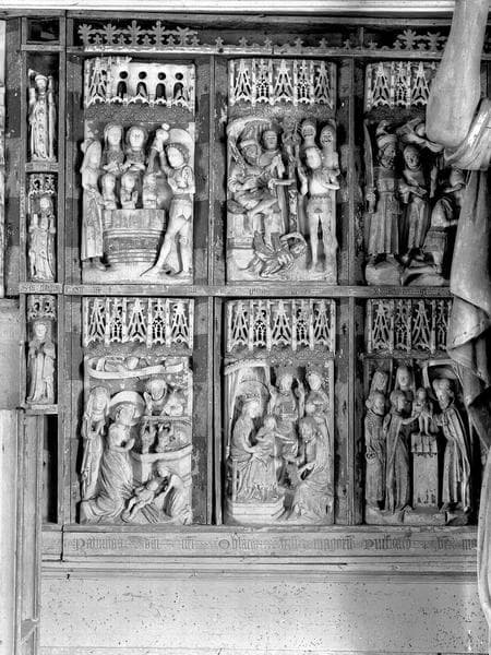 Retable du maître-autel, bas-relief et statuettes en albâtre : scènes de la vie de la Vierge et de la vie saint Georges (détail de la partie droite)